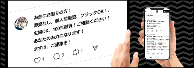 Twitter(X)やInstagramなどのSNSで「#お金貸します」といったハッシュタグを使い、個人を装ってお金を貸し付ける「個人間融資」がその代表例です。
